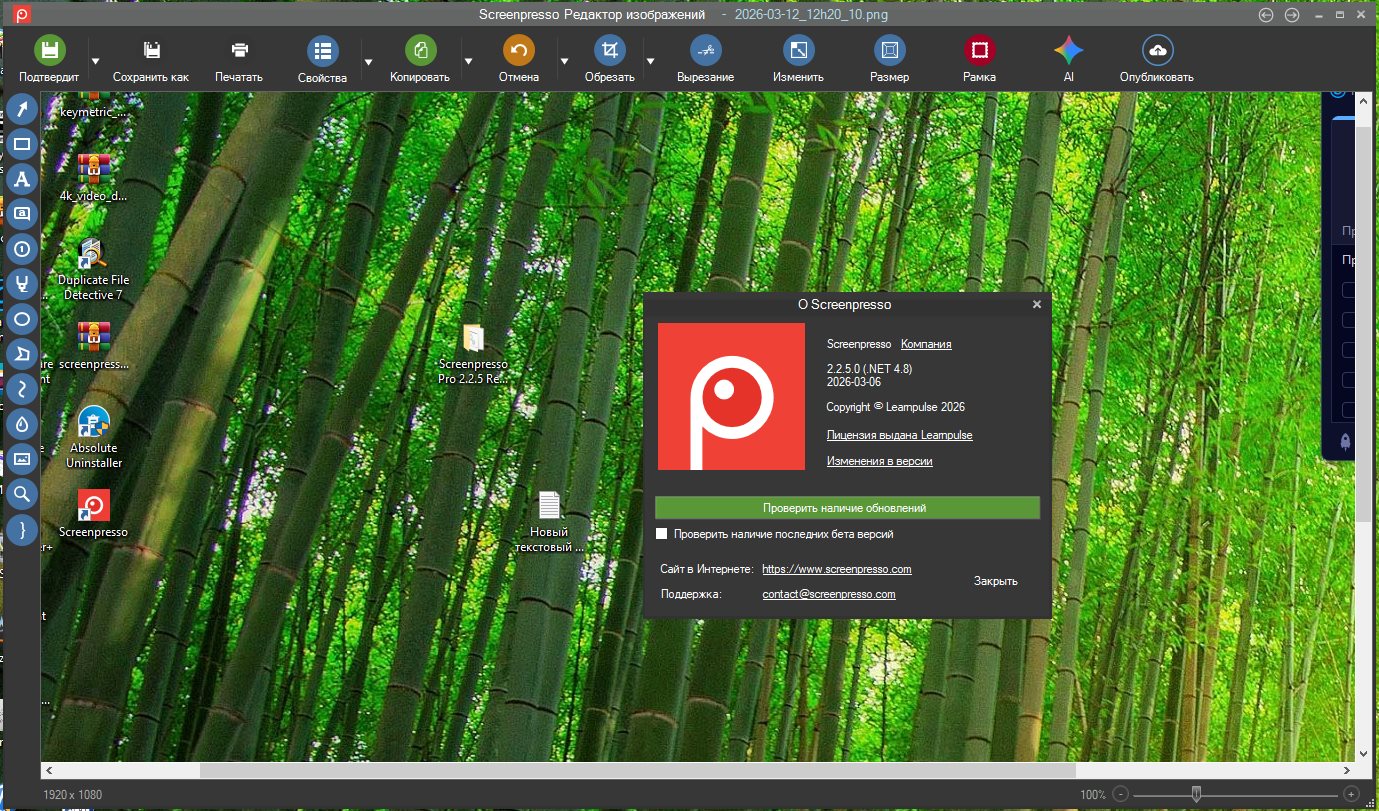Год выпуска:2026 Версия:2.2.5 Адрес оф. сайта:ссылка Автор сборки:LEARNPULSE SAS Язык интерфейса:Русский, Английский и др. Лечение:не требуется (инсталлятор уже пролечен) Системные требования: ОС:Windows 11 / 10 (64-bit) CPU: 2.0 GHz RAM: 4 GB HDD: 1 GB Microsoft .NET Framework 4.8 Описание: Screenpresso - легкий в использовании инструмент для создания скриншотов со встроенным редактором изображений и возможностью размещения готовых изображений в сети Интернет. С помощью программы можно делать снимки всего экрана, его части, конкретного окна (в том числе и с прокруткой), а также осуществлять захват видео высокого разрешения, с сохранением в форматы MP4, WebM, WMV, OGG или экспортом в HTML5. Встроенный редактор позволяет обрезать изображения, добавлять тени, закругленные углы, отражения, текст и многое другое. Готовые скриншоты можно отправить на Twitter, Facebook, G-Mail, Evernote, Flickr или FTP-сервер, а видео отправить на сервис Youtube.