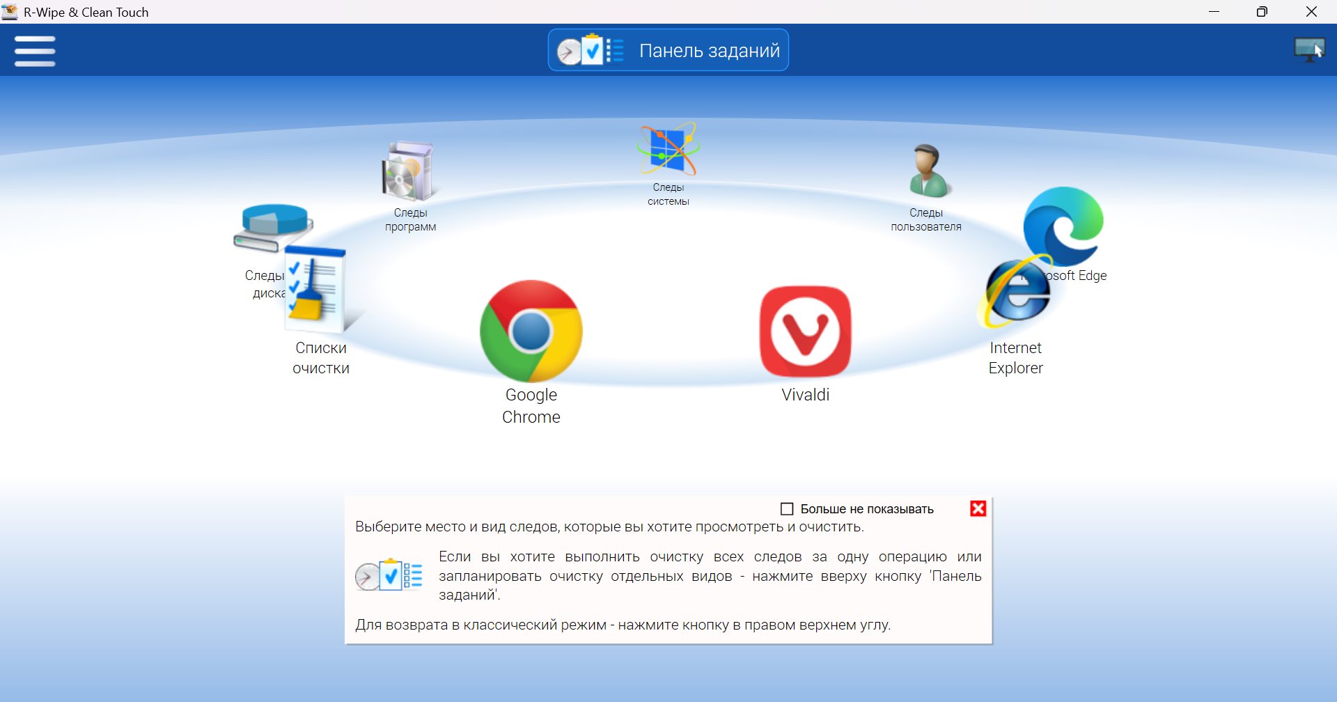 Сохранение конфиденциальности: Подтверждение и выбор информации перед полным удалением. Полное удаление временных интернет файлов. Полное удаление куки - небольших файлов, которые сохраняются на компьютере при посещении веб-сайтов для ускорения их последующего просмотра. При этом ваши избранные куки затронуты не будут. Полное удаление флеш-куки - небольших файлов, которые сохраняются на компьютере при посещении веб-сайтов. Полное удаление журналов Java и Microsoft VM. Очистка форм автозаполнения: имена пользователей, пароли и другая персональная информация, оставляемая на веб-сайтах, а также ключевые слова, используемые в инструментах поиска. Очистка журнала посещенных страниц. Очистка списка недавно использовавшихся документов. Очистка списка открытых файлов. Очистка содержимого буфера обмена Windows. Полное удаление временных файлов, созданных Windows и другими программами. Удаление информации из системного реестра: список запускавшийся приложений, результаты поиска, подключенные сетевые диски, подключенные внешние устройства, последний открытый ключ реестра и т.д. Полное удаление списка часто используемых компонент, хранящихся в системном реестре: программ, ссылок и ярлыков меню Пуск, элементов Панели управления, избранных веб-страниц и кнопок Internet Explorer. Полное удаление файлов .dat (в том числе заблокированных), содержащих информацию о некорректном завершении работы Windows. Полное удаление содержимого в режиме offline. Удаление оставшейся на компьютере информации от работы более чем 200 приложений, включая приложения Microsoft Office, стандартные приложения Windows и большое число других популярных программ. Инсталлированные приложения определяются автоматически. Создание списка для удаления оставшейся на компьютере информации от любого приложения, которое R-Wipe&Clean в настоящий момент не поддерживает. Такой список может включать как сами приложения, так и используемые ими временные папки, файлы и ключи реестра. Полное удаление файлов подкачки Windows. Полное удаление ярлыков, находящихся на вашем рабочем столе, но указывающих на несуществующие объекты. Очистка журнала событий Windows. Очистка журнала брандмауэра Windows. Удаление ссылок на открытые сетевые папки. Полное удаление временных файлов и файлов журнала инсталляторов, dump файлов памяти, старых файлов проверки диска. Полное удаление файлов из папки Prefetch. Полное удаление списка файлов и папок, необходимых для процесса дефрагментации. Удаление настроек свойств папок в Windows Explorer. Удаление описаний запущенных приложений. Полное удаление хранящихся в кеш-памяти инсталлированных шрифтов и ярлыков запущенных приложений. Полное удаление журналов Windows Update. Полное удаление журналов WMI, журналов диагностики и журналов центра обеспечения безопасности. Полное удаление сохраненных сетевых паролей. Полное удаление сохраненных в кеш-памяти дополнительных вкладок приложений. Полное удаление сохраненных адресов непрочитанной электронной почты. Полное удаление сохраненных папок FTP. Полное удаление сохраненной последовательности пунктов меню Пуск. Полное удаление сохраненных в кэше обоев рабочего стола Windows. Полное удаление файлов: Поддержка файловых систем FAT и NTFS. Полное удаление файлов с использованием эффективных и надежных алгоритмов, включая DOD. Возможность полного удаления файлов прямо из Windo