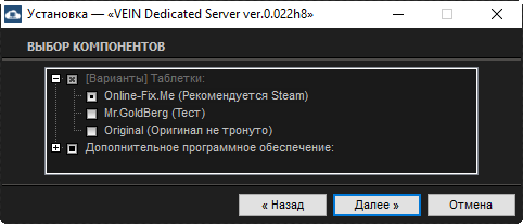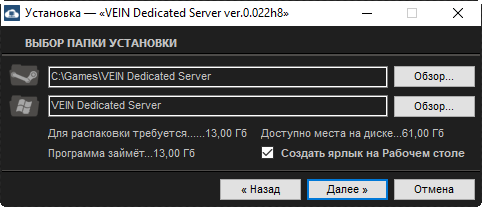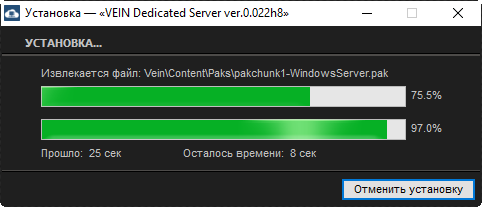 1. Устанавливаем выделенный сервер из папки VEIN Dedicated Server v.0.022h8 RePack by Vlad'989; 2. Изменяем порты при необходимости в файле Start_Server.bat; 3. Открываем все необходимые порты; 4. Запускаем сервер ярлыком VEIN Dedicated Server на рабочем столе. или файлом Start_Server.bat из папки сервера; 5. Подключаемся к своему серверу через список серверов. Или в поиске по названию VEIN Dedicated Server #1 [OFME]. Можно изменить ярлыком на рабочем столе VEIN Server Settings; 6. Если не отображается список серверов то устанавливаем VPN который идет вместе с репаком сервера;